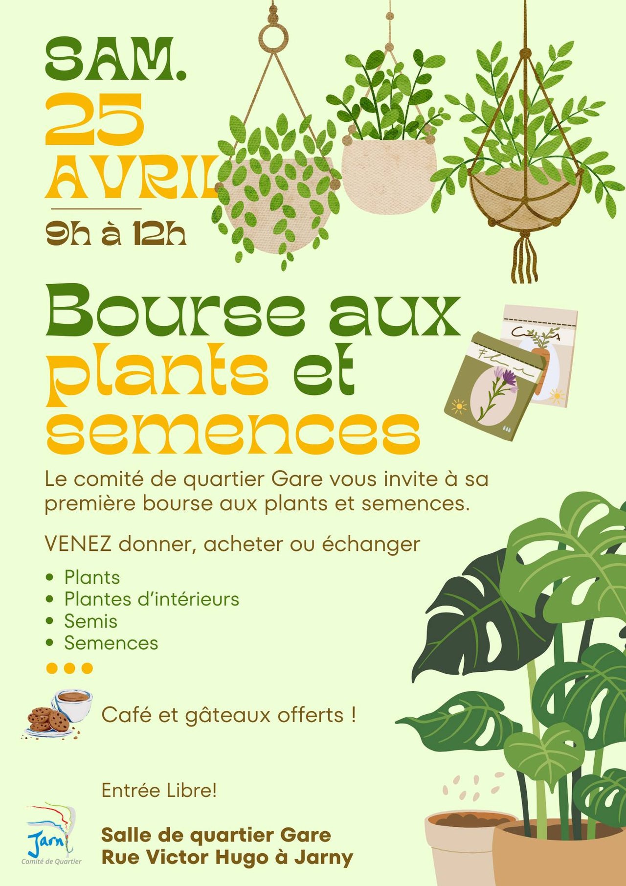Le Comité de quartier Gare vous invite à sa bourse aux plants et semences le samedi 25 avril de 9h à 12h, à la Salle de quartier Gare. Un moment convivial pour :